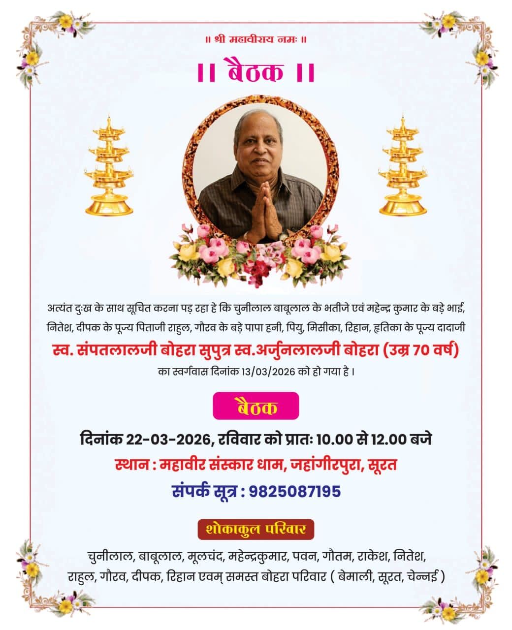 *श्री संपतलालजी बोहरा (उम्र ७० वर्ष) सुपुत्र स्व.अर्जुनलालजी बोहरा* का स्वर्गवास दिनांक 13/03/2026 को चेन्नई में हो गया था ।