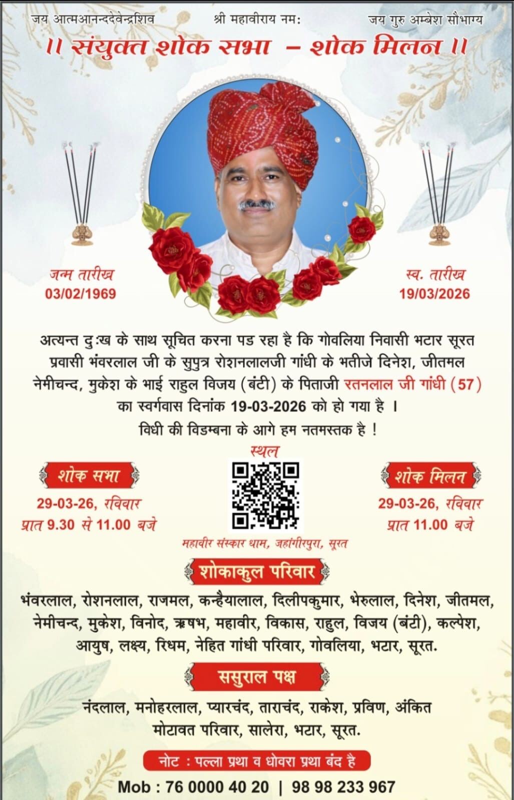 . *li.दुखद.अवसान.li* . !!श्री महावीराय नम:!! . अत्यंत दुख के साथ सुचित करना पड रहा है कि भंवरलालजी पितलीया (टाडगढ़) अडाजन,सुरत के सुपुत्र मनोहरलाल, प्रकाशचंद, अशोक कुमार, दिनेश, अनील,रमेश,विजय, गोपाल, मुलचंद के भाई विपुल,अल्पेश, आशीष के पिताजी विशाल, विवेक,विरल, शुभम्, वैभव के बड़े पापा *तेजकरणजी (65)* का स्वर्गवास आज हुआ है अंतिम यात्रा कल 26/3 गुरुवार सुबह 11 बजे निवास स्थान A 1001 शंखेश्वर हाईट राजहंस सीनेमा के पास श्रीपद अनंन्ता रोड पाल से जहांगीर पुरा जायेगी 9426812321 9825194886 *ससुराल पक्ष:-* मदनलालजी,श्यामलालजी,राजेश कुमारजी,मुकेश कुमारजी,दिनेश कुमारजी,अनील कुमारजी,संतोष कुमारजी, विकास कुमारजी,धवल कुमारजी मारू (भीम) सुरत मैसूर