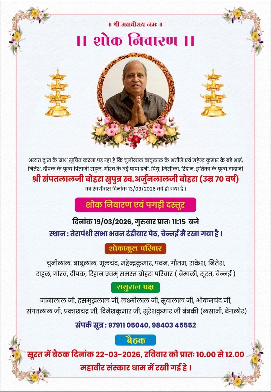 *दुखद अवसान* अत्यंत दुःख के साथ सूचित करना पड़ रहा हे की चुनिलाल बाबूलाल के भतीजे महेन्द्र कुमार के बड़े भाई ,नितेश, दीपक के पूज्य पिताजी राहुल,गौरव के बड़े पापा हनी पियु मिसीका रिहान हृतिका के पूज्य दादाजी श्री संपतलालजी बोहरा (उम्र ७० वर्ष) सुपुत्र स्व.अर्जुनलालजी बोहरा का स्वर्गवास दिनांक 13/03/2026 को हो गया है । उनकी अंतिमयात्राआज दिनांक 14/03/2026 दोपहर 4 बजे निवासस्थान 59/21 न्यू ठंडावरायण स्ट्रीट ओल्ड वॉशरमेनपेट चेन्नई से चौलाई मुक्तिधाम जाएगी । *शोकाकुल परिवार* चुनीलाल ,बाबूलाल,मूलचंद,महेन्द्रकुमार,गौतम,पवन,नितेश,राहुल, गौरव,दीपक , रिहान एवम् समस्त *बोहरा परिवार* (बेमाली ,सूरत,चेन्नई) *ससुराल पक्ष* नानालाल ,हसमुखलाल,लक्ष्मीलाल,सुवालाल, भीकमचंद,संपतलाल, प्रकाशचंद्र,दिनेशकुमार,सुरेश कुमार जी बंबकी (लसानी, बैंगलोर) 97911 05040 98403 45552